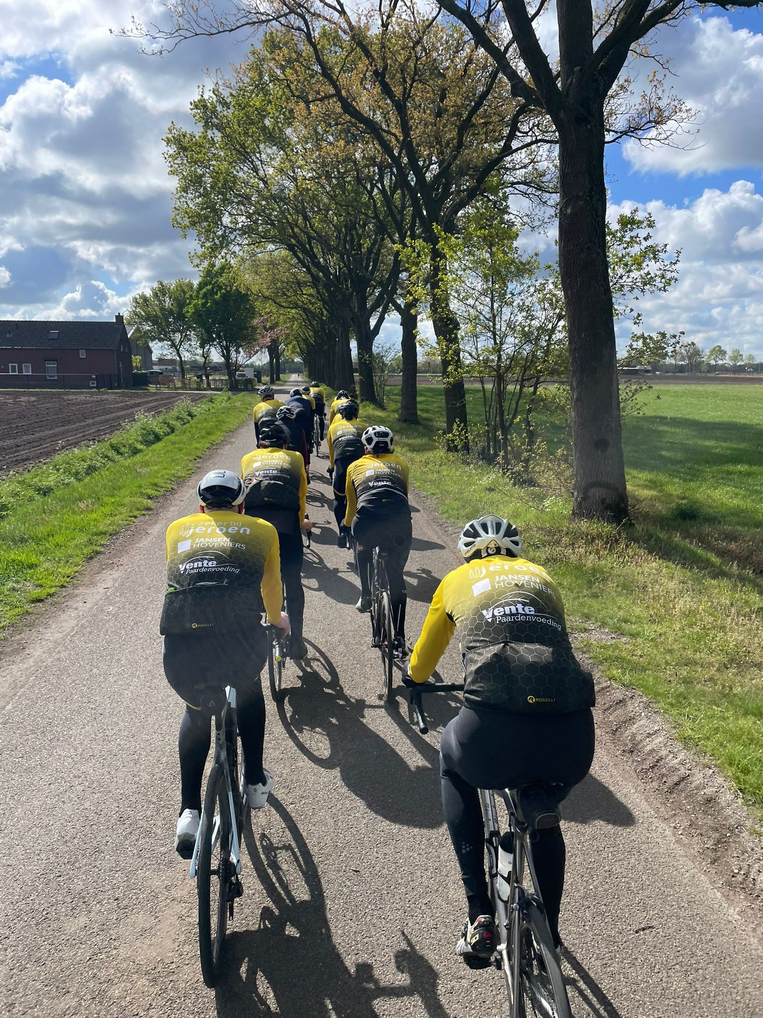 We rijden verder richting Stampersgat. De lente is duidelijk aangebroken, de bloemenvelden lachen ons tegemoet. Een zondagmorgen zonder zorgen, heerlijk genieten! Bij Gastelsveer, trekt het gele peloton de Vliet over en zetten we koers richting Roosendaal. Links zien we in de verte Shopping Center Rosada liggen. Martin buigt af. Trekt dit koopwalhalla te veel aan hem? Later blijkt dat hij ons alvast vooruit is gereden om bij Het Wapen van Nassau de derde helft voor ons te organiseren.